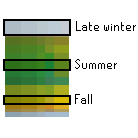 These are the materials/shaders that change their color throughout the year. The secret lies in a 2d look up table, which seems to be called a grid internally, with the x axis being the gradient lookup table/color palette to apply colors to objects, and the y axis being the different luts to apply throughout the year! Then each object has another grayscale texture, which goes through the x-axis lut to get the proper color. By changing the y axis value based on the time of year.